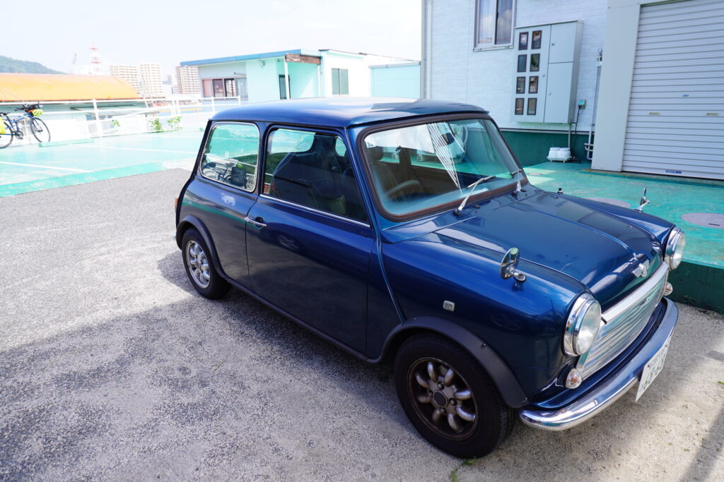 This old mini-cooper was in the parking lot.