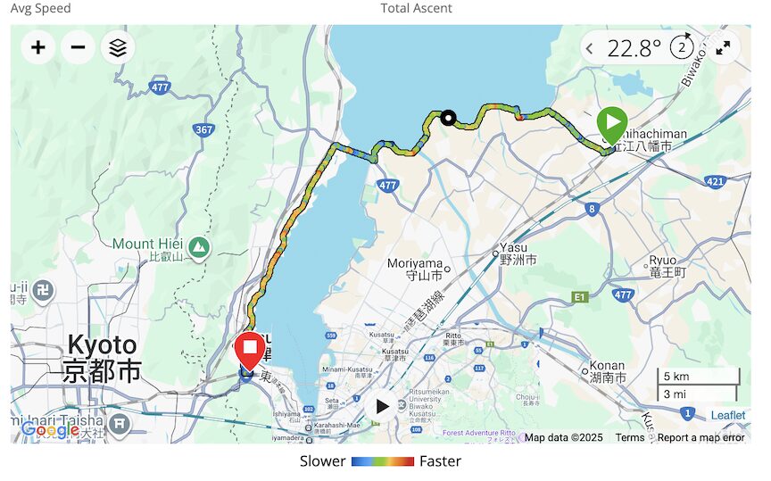 I have said it before and no doubt I will say it again, what a difference a day makes. We had a good breakfast in the apartment/hotel and headed out to the train station. We are catching another train because RidewithGPS and google maps could not find cycling directions to Hikone. We could have followed the walking directions but, we may have ended up on forest tracks.