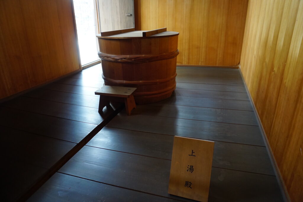 There were five toilets in the Honjin,one was reserved for the daimyo (lFeudal Landlord). There were three bath tubs, the water was boiled and then added to the tub. Although there were bath tubs provided some of the daimyo would bring their own luxurious bath tubs.