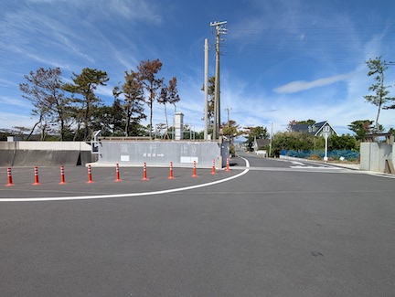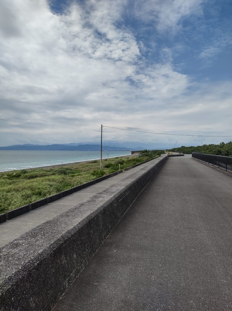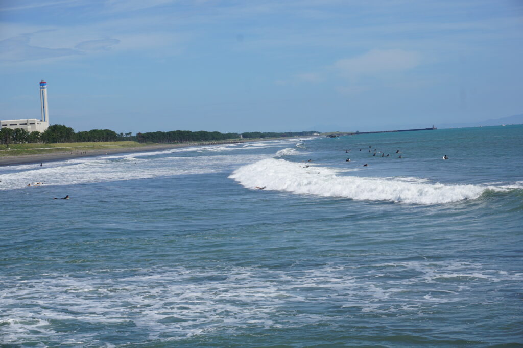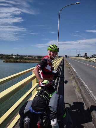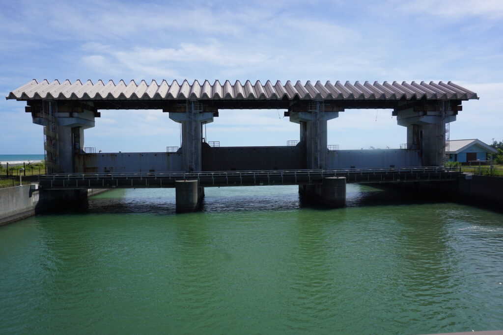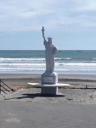 Not sure why Lady Liberty is here at the surfing beach. As we cycle along the coast we notice a lot of the flood protection and Tsunami gates that are in place.