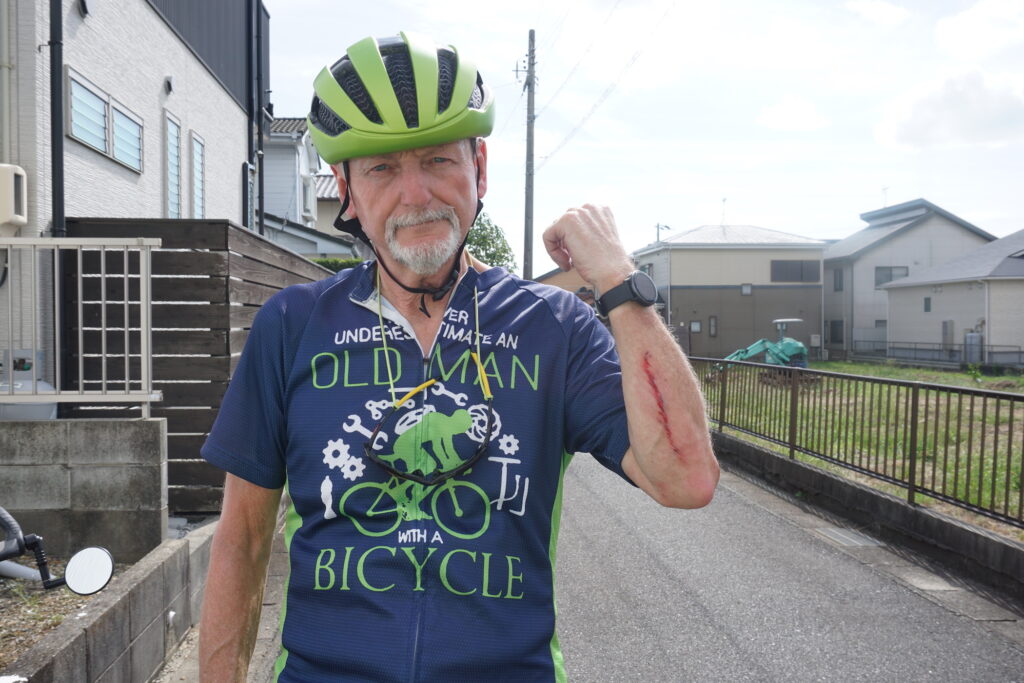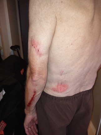 After the train had passed we walked the bikes to the other side, and I cleaned Ralf’s arm and slathered some antiseptic cream on his forearm.  It was only later in the room that I saw the extent of the damage done to his old body.