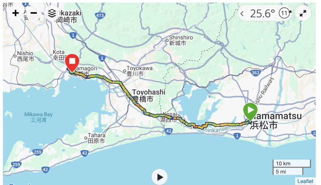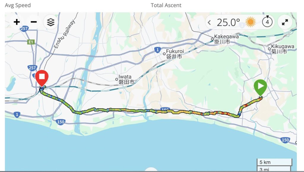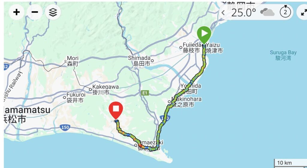 Today’s planned ride was anything from 35 km to 47 km. Sometimes RidewithGPS, Garmin and Google maps have different ideas as to which way we should cycle. RidewithGPS won today and got us to Hamamatsu at 37.6 km. It was a lovely route with the occasional sections on Highway 105 which is a busy road. The Pacific Coast Cycle Route would have taken us down to the coast and then back up to Hamamatsu. As we had plugged in the address to the hotel the Garmin didn’t add the extra 20 kms to the coast.