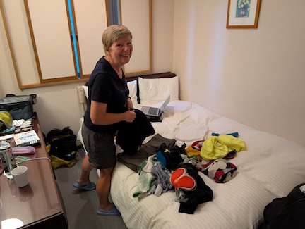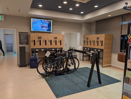 When entering the hotel, you had to take your shoes off and put them into a locker, then put the provided slippers on – no shoes past the green carpeted area or in the room. All wheels on the luggage had to be washed – wipes were provided. Of course, we couldn’t take the bikes into the room unless they were bagged.